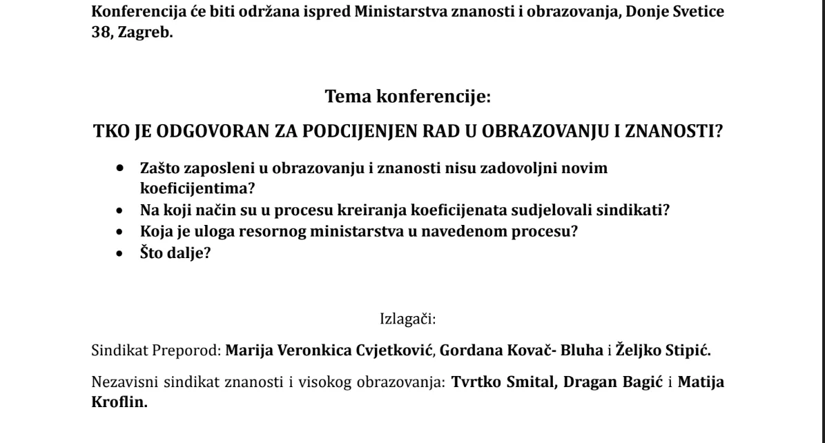 Akademski sindikat, Carinski sindikat Hrvatske i Školski sindikat Preporod organiziralisu u srijedu, 6. prosinca, okrugli stol s temom „Što donosi zakon o plaćama u državnoj službii javnim...