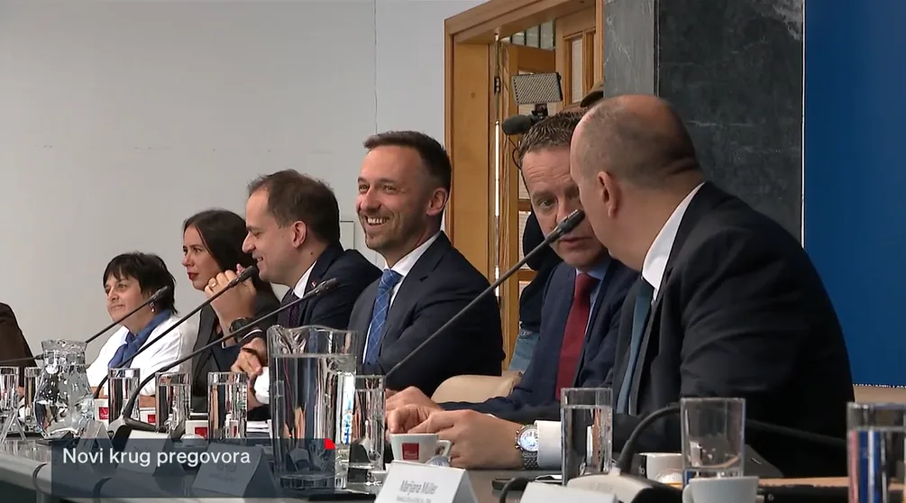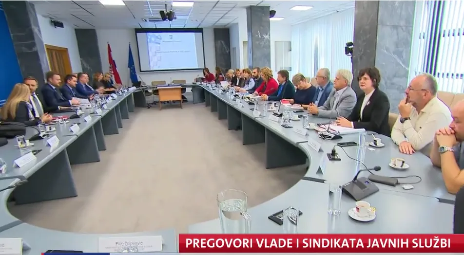 (Izvještaj sa 2. sastanka pregovaračkih odbora održanog 9. listopada) Ministarski trojac s prvog sastanka, Marko Primorac, Marin Piletić i Ivan Malenica, u društvu nekolicine državnih tajnika i...