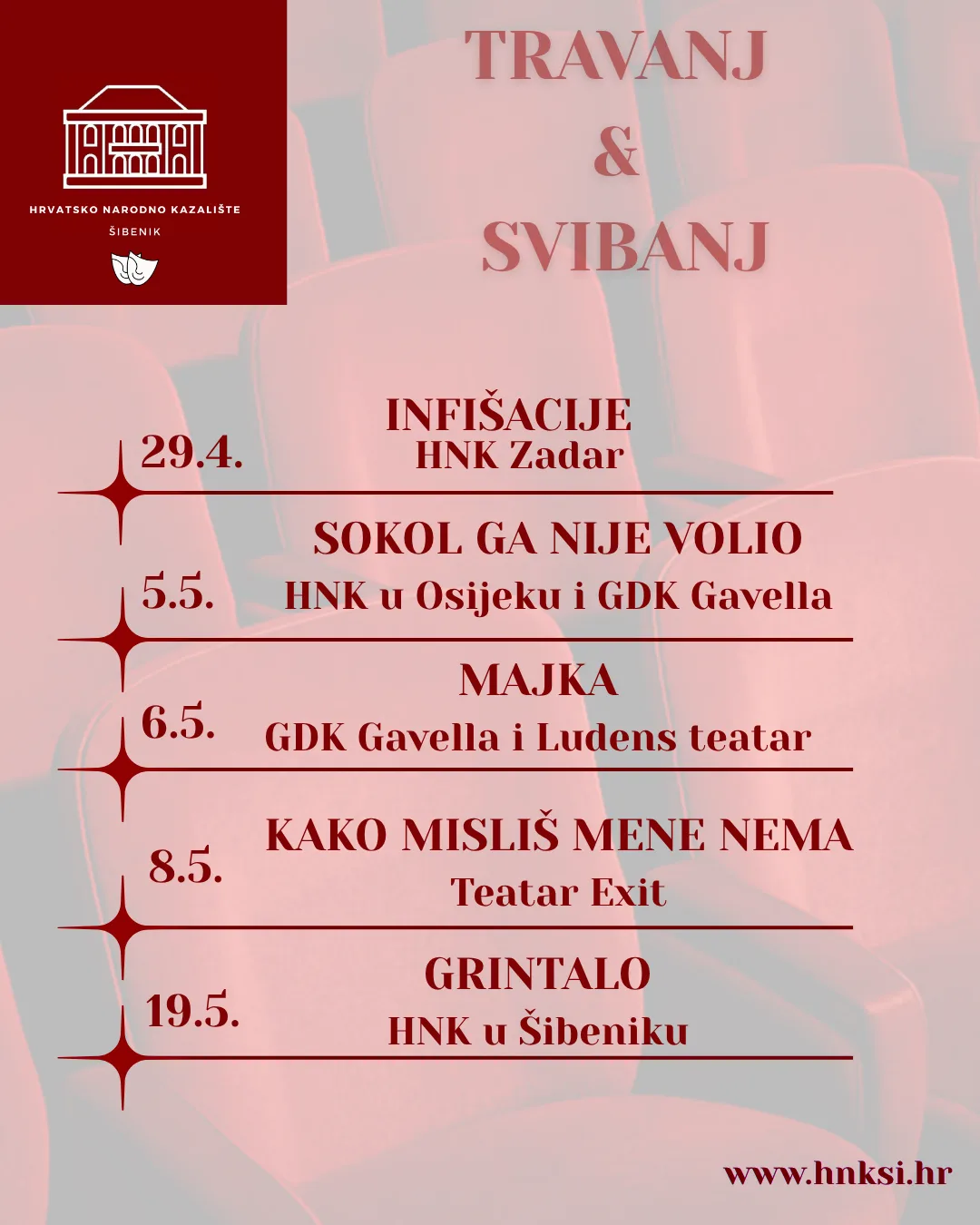 Svi programi počinju u 20:00, a ulaznice su dostupne na blagajni kazališta.